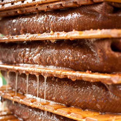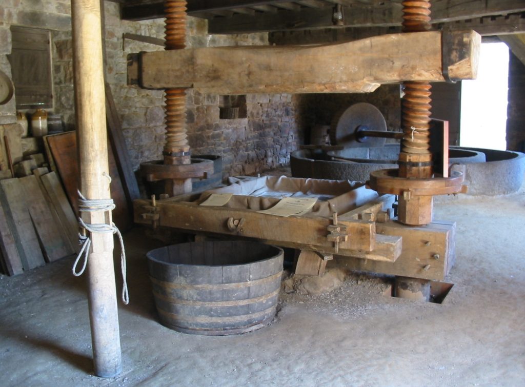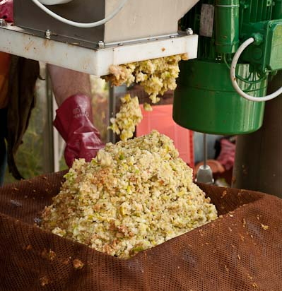 The pulp is then pressed to extract the juice – using a traditional style press, the pulp is built into a “cheese” by either adding layers of straw and pulp alternately to build the cheese (with the straw also providing the juice with a route to flow out of the cheese during pressing) or by wrapping the pulp in cloths and placing wooden racks between cloths (with the racks helping the juice to flow from the cheese during pressing). The cheese is then pressed using a screw or hydraulic mechanism to provide downward pressure (sometimes many tons of pressure) and the juice will start to flow (provided the cheese has been built properly and doesn’t collapse!). An alternative to this method is to use a basket press, where the pulp is loaded into a wooden basket and then pressed, in a similar way to the way grapes are pressed for winemaking.
