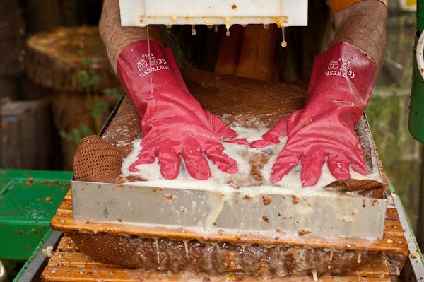 Apples are collected in the autumn and washed and sorted. Although a small quantity of damaged or rotten fruit may be used, the amount should be limited. The fruit is then crushed (or milled) to help with juice extraction (when starting off making cider, I used a pickaxe handle and bucket to crush the fruit!). Although electric mills are commonly used by many small-scale cidermakers, some use a scratter (spiked rollers that crush the fruit) and historically, the fruit was loaded into a circular stone channel in which a vertical circular stone was rolled round (often pulled by a horse or farmworkers) to crush the fruit.